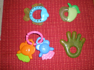 игрушки для самых маленьких (музыкальные, погремушки, грызки - фирмы: канпол, нуби, мир детства, икея, ккидс, толо, тини лав и др...+ воротник шанца 4 см+ортоподушечка+большой гимнастический мяч с рожками диаметр 50 см (сделано в германии) + тарелочка в виде мишки, разделена на две части, к ней идут ложечка и вилочка (Саnpol) + бортики в кроватку (светло зеленый и бежевые цвета)) за все 1000 р (примерно в 4 раза дешевле чем обошлось нам..состояние у вещей отличное)...
