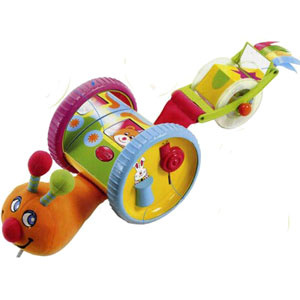 к активным движениям, способствует умственному развитию ребенка. Каталку Улитку можно возить за веревочку или просто играть с ней. Мягкая Улитка везет домик на колесах с прицепом. При этом раздаются разнообразные звуковые и шумовые эффекты, привлекающие внимание малыша. Прицеп - вращающийся прозрачный барабан с разноцветными шариками внутри, с маленьким зеркальцем и атласными ленточками на хвосте. Он прикреплен к повозке мягким шуршащим ремешком. Если нажать на кнопку повозки, выскакивает пассажир - маленький медвежонок в прозрачной коробочке. Он снова спрячется в повозку, если на него надавить. В больших колесах повозки двигаются рычажки и меняется картинка.