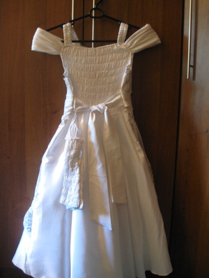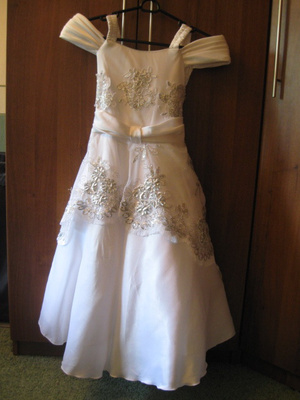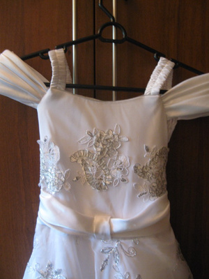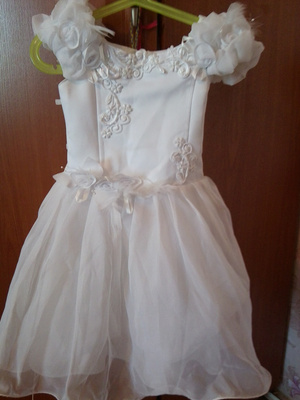 Платье для девочки ПРОДАМ. Белоснежное с кружевным шитьем серебряного цвета, сзади резиночки на лифе, в комплекте идут митенки, юбка с множеством подъюбников.