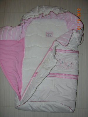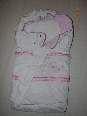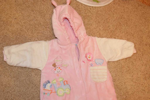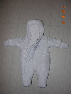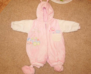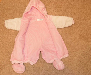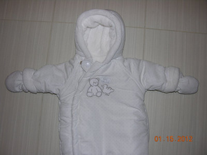 велюровый комбезик на тонком синтепоне на теплую весну-осень-прохладное лето 0-3мес, но мы носили до до4мес.хор сост. 350. очень удобный, доча засыпала на улице, дома комбезик полностью расстегивала и малышка досыпала как на матрасике.