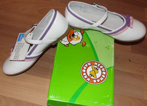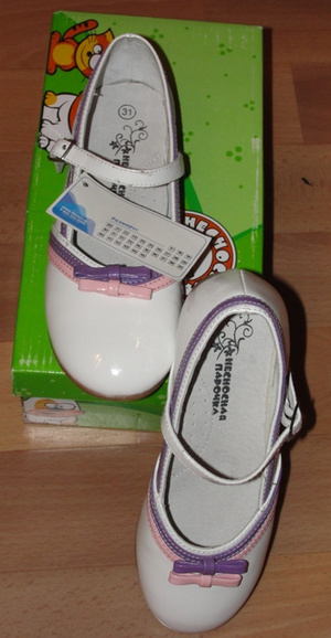 Продам детские туфли (для девочки) праздничные нарядные, белые лаковые с розовыми ленточками "несносная парочка" в упаковке не ношеные. рр 31 длина по стельке 19 см. - 1000р. Забирать на "Чемском"
