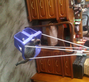 качеля на ребенка лет 3-4 на толстых капроновых подвесах со стальными кольцами, 200 руб - хоть домой, хоть на дачу (у меня котейко прыгнуло туда во время фотографирования и скособочило, а вообще качеля ровная и сбалансированная)