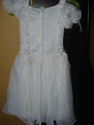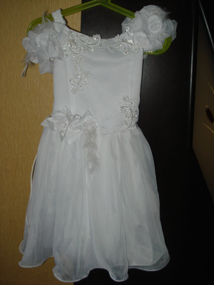 Платье (на фото неглаженое) б/у пару утренников, пятен, потертостей нет. Ширина груди 29см. талия 27, по всей спине две шнуровки по 6 см каждая, можно уменьшить объем груди и талии! В полностью затянутом состоянии талия 22 см. ну и объем груди естественно уменьшается! Длинна от плеча до талии 25-27см, подол 35-37 см. Смотреть на МЖК, могу привезти на Золотую Ниву в будни. Цена 250 рублей.Продано