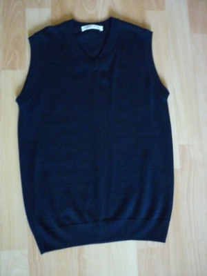 Жилет темно-синий. 50% шерсть мериноса, 50% акрил. На рост 152-160. Б/у пару раз. Цена 350 руб.