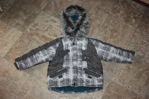 Очень теплая курточка зимняя, наполнитель искусственный, грудь и спинка дополнительно утеплены флисом. Теплая, плотная, толстенькая, но легкая. Капюшон внутри полностью на иск. меху. Размер 4Т на 4-5 лет рост примерно до 110см. Куплена в Америке, не подошла по размеру. Цена 2 т.р.