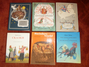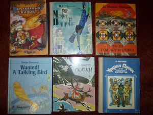 Детские сказки разные, есть на русском-английском синхронно, на разных сторонах раскрытой книги.