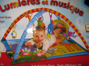 И развивающий коврик. С различными пищалками и шуршалками, с цветомузыкальными цветочками на основе. 4 мелодии в разных режимах, короткие и долгоиграющие. Игрушки на дугах погремушки, шуршалки и жужжалки(слон с моторчиком), плюс безопасное зеркальце. Состояние хорошее (немного поцарапано зеркало).