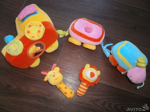 И развивающий коврик. С различными пищалками и шуршалками, с цветомузыкальными цветочками на основе. 4 мелодии в разных режимах, короткие и долгоиграющие. Игрушки на дугах погремушки, шуршалки и жужжалки(слон с моторчиком), плюс безопасное зеркальце. Состояние хорошее (немного поцарапано зеркало).