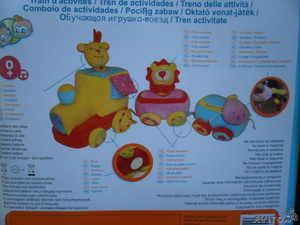 На трубе поезда-погремушка!Окна и передняя часть паровозика сделаны из красивых,отражающих вставок. Шурщащие колеса всех фургончиков-привлекут внимание вашего малыша! На дне поезда-безопасное зеркальце!Пассажиры поезда: Жирафик с погремушкой и рычащий львенок (музыкальн. чип)-вытаскиваются и удобно ложатся малютке в ручку!В последнем фургончике едет паучок,при нажатии на головку которого вы услышите пищащие звуки, а оттянув паучка приведете в действие вибрирующий механизм!Вагончики паровозика разделяются,что позволяет играть с паровозиком нескольким малышам одновременно!