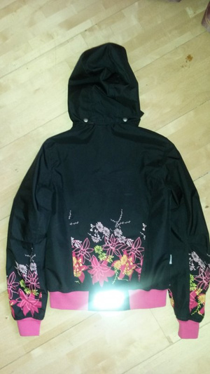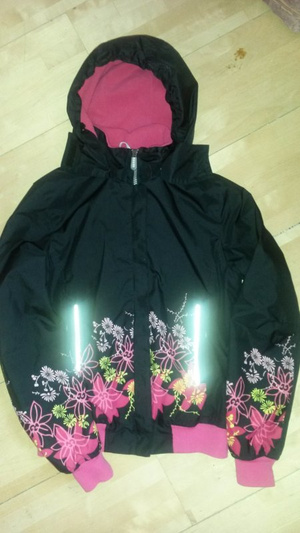 Очень красивая, яркая. Капюшон отстегивается. На рукавах трикотажные манжеты.