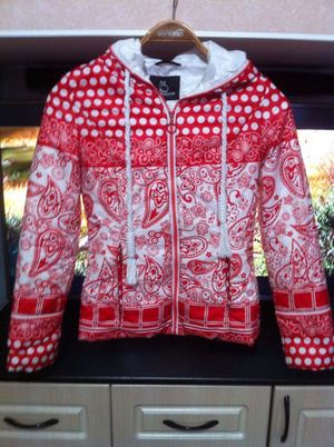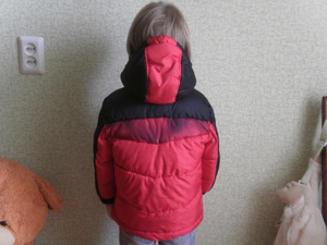Цвет насыщено красный. Застежка молния + липучки. Капюшон (мелковатый, но у нас были теплые шапки и особо им не пользовались) не отстегивается, на липучках (очень плотно прилегает к вороту, поэтому не пользовались шарфами). Рукава резинка + липучка. Спинка, капюшон и ворот утеплены флисом. С теплой кофтой носили до -10ºС.