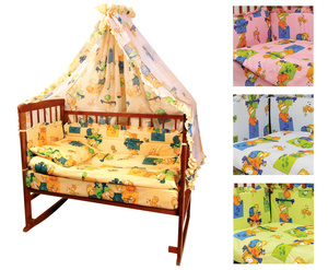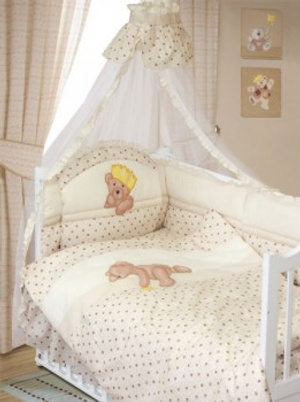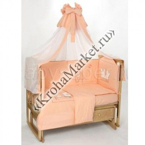В комплект входят: пододеяльник, наволочка, подушка, балдахин, наволочка на резинке, подматрасник,бампер (состоит из 6 частей).