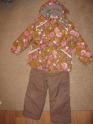 1.Костюм Хуппа, утеплитель 300 гр куртка, 160 гр штаны. Размер 116, от 108 до 116 можно носить. б/у 2 сезона. косяки: порез в районе коленки и потертости по низу на штанинах и на куртке нет 2-ой снизу кнопки.
