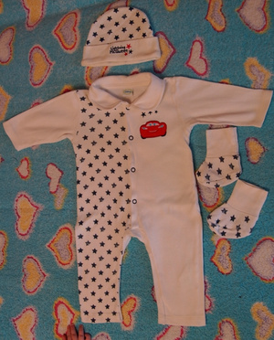 Комбинезончик Дисней, шапочка и пинетки, от 0 и до 4 мес., в отл. состоянии, только на пинетках немного катышков. Очень красивый и необычный наборчик, 250 руб. Сфотать нормально не получилось,он молочного цвета и синенькие звездочки.
