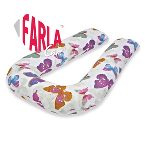 У меня U-образная подушка, получалось что голова в закруглении, один конец под поясницу, другой под живот и между колен. Поза полубоком, мне удобно было.