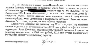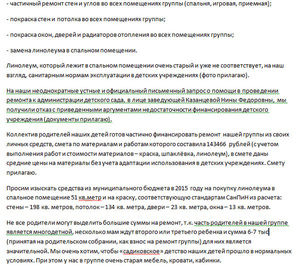 писала письмо сначала заведующей, она естественно отписалась - денег не предусмотрено, потом в мэрию - вот что писала и какой ответ получила - все классно! и фотки нашего линолеума, который без "трещин и порывов". Те я прямо написала, что мы собираем деньги на ремонт и много (а это вроде как вообще запрещено и есть какой то закон о коррупции) - и всем пофиг!