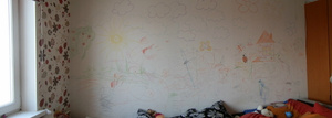 Кстати, часть рисунков восковыми карандашами и акварелью легко оттерлись с обоев меламиновыми губками