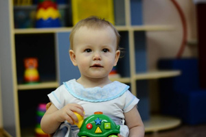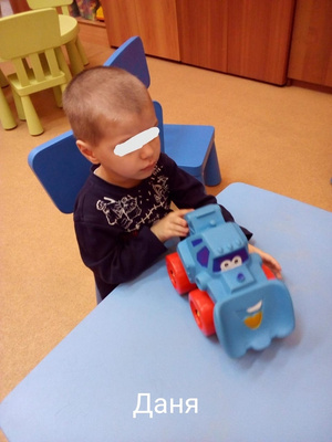 Обращенную речь малыш понимают всю, но разговаривает пока на своем языке. Несмотря на особенности зрения, он прекрасно все видит, и сначала пристально рассмотрит, потом возьмет и положит на место. У него хорошо развита мелкая моторика, есть терпение и кропотливость.