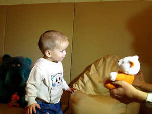 Вадиму в марте исполнится три года. На вид ему конечно значительно меньше. Вадик маленький и худенький. Этот темноглазый мальчишка еще не умеет разговаривать. И все же ребенок сообразительный и отзывчивый. У него хорошие ответные реакции на беседы с ним и предложения принести игрушку или залезть на горку. Особенно Вадик любит музыку и музыкальные игрушки. Он с удовольствием откликается на просьбу потанцевать. И это несмотря на то, что у малыша есть проблема с суставом. Врачам и воспитателям очевидно, что при ползании его ножка торчит вверх. Даже хромая, он активно двигается. В раннем малышовом возрасте Вадика его отец много носил ребенка в переноске, что еще более усугубило врожденный вывих.