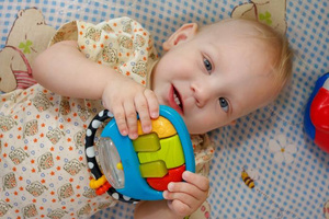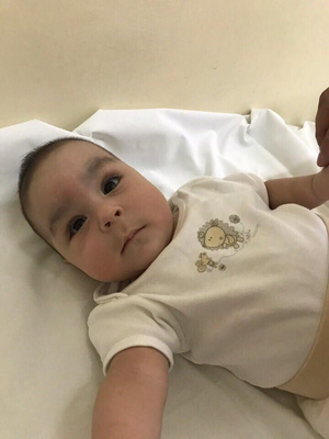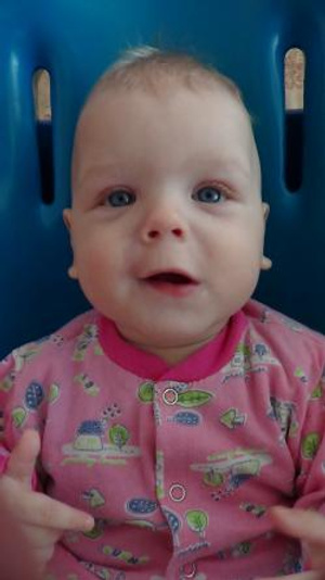 Саша спокойный, контактный ребенок. Улыбается, гулит. Хорошо кушает, быстро засыпает на руках. Прислушивается внимательно к громким звукам, поворачивает голову на звук, следит взглядом.