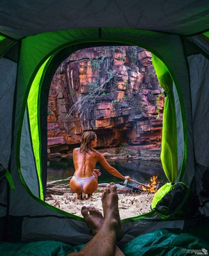 Тетка неубедительная, кто же в турпоход идет в кружевных трусах.