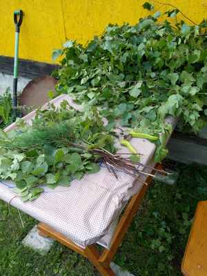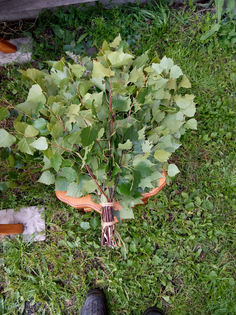 Зато сделал вещь! Давно облизывался, когда смотрел Сталика.Добавлю немного. Заканчиваю сезон заготовки веников. Просмотрел как делают другие и взял кое что новое для себя. На клеенке на столе нарисовал контур веника и на него накладываю ветки. Ветки для удобства нарезал в окрестностях и привез на машине.