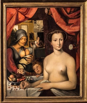«Габриэль д’Эстре с сестрой», Неизвестный художник, ок. 1594. Возлюбленная Генриха IV, также неоднократно изображалась обнаженной.