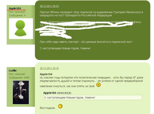 Все темы с объявлениями любых партий и движений о местах сбора подписей в поддержку выдвижения кандидатов на тот или иной пост всегда удалялись с форума. Нет никаких оснований менять правила форума персонально для Григория Явлинского. На своём личном сайте и сайте своей партии он может вводить любые правила и размещать любые объявления. Но в чужой монастырь со своим уставом пусть не лезет.