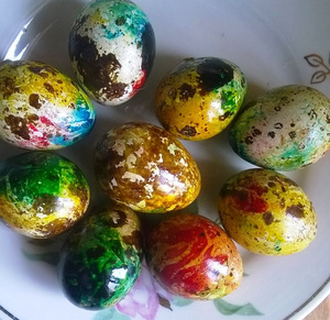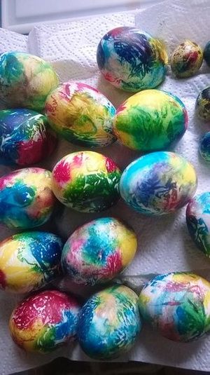 - Когда все яйца будут окрашены, разверните яйца и положите на бумажную поверхность для высыхания. Можно еще натереть их салфеткой, смоченой в раст. масле - тогда они будут блестеть :)