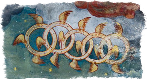 , им присваивается обычно место третьего чина первой степени, то есть самых ближайших к Творцу (серафимы, херувимы, престолы). Основываясь на их имени, предполагается, что Господь Вседержитель «восседает на них, как на троне или престоле»[2]. Точное назначение нам не известно.из гностических источников известно, что Престолы изображаются в виде огненных колес с глазами на ободах. У них имеется по четыре крыла. Изначально в таком виде изображались Херувимы, но позднее их облик стал ближе к Серафимам, а огненные колеса еще некоторое время были их атрибутами. В еврейской культуре третий чин называется Колесами, или Офанимами.