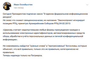 «Церковь считает недопустимыми любые формы принуждения граждан к использованию электронных идентификаторов, автоматизированных средств сбора, обработки и учёта персональных данных и личной конфиденциальной информации».