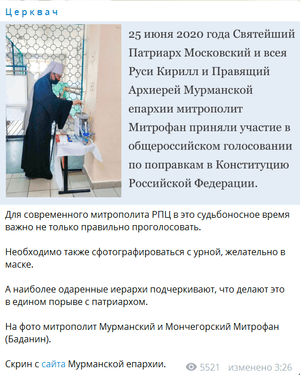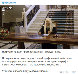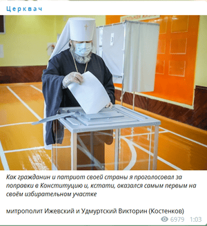 Я не слышал от своего прихода никакой политической агитации о голосовании к поправкам конституции РФ.Так и слава Богу, что не слышал, и я не слышал. Но на уровне Патриарха и правящих архиереев выступления есть, записываемые в том числе на территориях церковных.