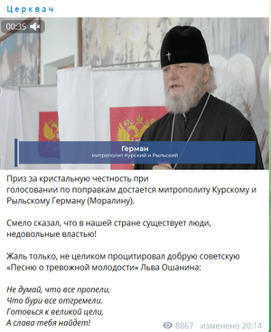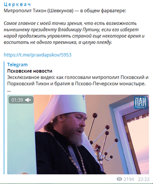 Так а чего творится, агитация ведётся, выше Святейший Патриарх на территории Свято-Данилова монастыря... теперь и митрополит Псковский и Порховский продолжил. Так они ещё и в монастырь притащили свадебных генералов - губернатора Псковской области и министра науки и высшего образования