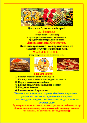 23 февраля в притворе храма состоится поздравление в честь Дня защитника Отечества и народное гуляние в первый день Масленой (Сырной) седмицы.