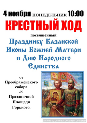 4 ноября 2019 года состоится крестный ход посвященный празднику иконы Божьей Матери Казанская и Дню народного единства. Крестный ход пройдёт от Преображенского кафедрального собора до главной площади города Бердска. Начало в 10:00