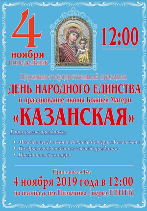 Дорогие братья и сёстры! 4 ноября, в день празднования «Казанской» иконы Божией Матери, ждём всех вас на площади им. Пименова (возле ГПНТБ), где состоится праздничный молебен перед иконой Божией Матери «Казанская». Начало в 12.00.