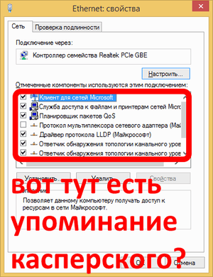 В настройках сети есть какое-либо упоминание о NDIS-драйвере каспера? Удалить, перегрузить.Вот наконец-то я и дома, и смог посмотреть то, о чём Вы пишите. Нет там никакого упоминания об этом. Есть 4 стандартных компонента и всё. Обнаружил я только вот что: есть в "Сетевых подключениях" помимо обычного "Подключения по локальной сети" некое "Подключение к интернету", которое ни отключить, ни удалить нельзя. При отключении самого Подключения по локальной сети это подключение к интернету пропадает и в сетевых подключениях остаётся только один пункт. Может, собака зарыта где-то здесь?