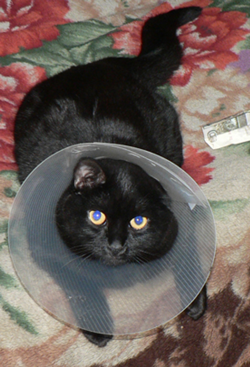 Конечно, это есть наглый шантаж и желание сесть на шею и лапы свесить. Видели бы Вы Фанину мордель в первые дни после операции! Вот где вселенские муки были написаны крупными буквами! И ничего - и ела, и пила, и спала, и играла в ведре, ничуть оно ей не мешало.