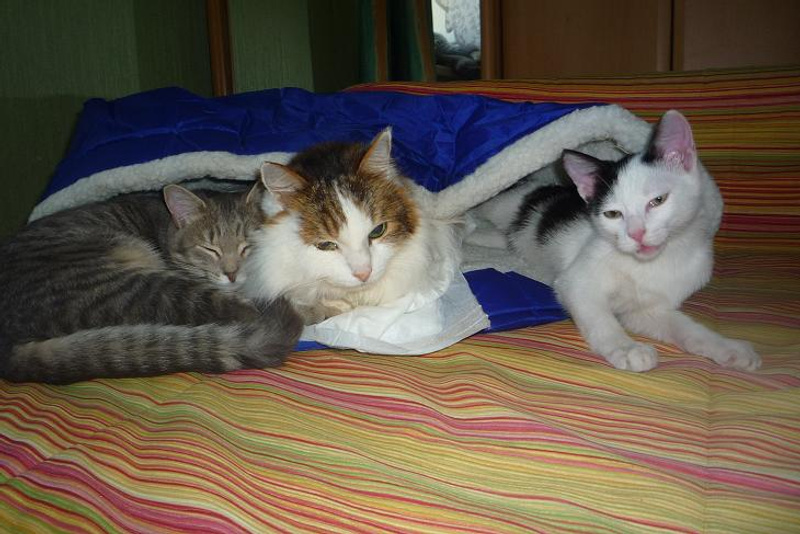 Над остальными трясусь, хоть их и много. Хотела Марсику (старшему) в профилактических целях сделать биохимию крови, да ничего не получилось: не смогли взять кровь, венки тонкие, лопаются. Только синяки остались. Муж сказал, что больше не даст своего кота (он его принес когда-то в дом, еще в Ашхабаде) мучить из-за того, что я захотела просто проверить. Говорит, что живет в здравии кот 16,5 лет и пусть дальше живет. Но я то как лучше хочу, все-таки возраст у котишки серьезный.