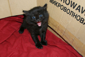 Мишка родился у подвальной кошки-мамы на передержке, не успели кошечку простерилизовать, родилось их 4-ро. Кошка настроена была враждебно, котята увидели человека в 3 недели и все разом шипели на меня. А в 1 мес я сделала вот это фото, Мишка на меня шипел, а я говорила, какой же ты классный. Он был весь черный-черный, как уголек и эти котеночьи синие глаза меня свели с ума. Так состоялось наше знакомство. Долго ему выбирала хозяев, очень боялась отдать не туда. Когда Мише было 6 мес, умерла бабушка с передержки и мне пришлось этого черного бандита взять к себе. Ну и отдать уже не могла по истечении какого то времени. Видимо у нас любовь с первого взгляда, судьба что ли. Ну и дружба между котами тоже сыграла свою роль, Гришенька принял Мишу с первой же минуты.