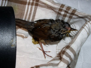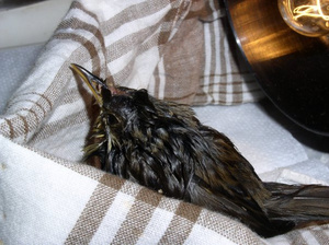 Помощь, любая, очень нужна. Вчера его нашла на улице около работы (кстати, город Новосибирск), летать не умеет, либо летает на очень маленькие расстояния. За весь день вчера выпил только воду. Вечером и утром поел безмолочную смесь и попил воды. Весь день бегал по комнате и едой не удалось накормить. Вчера вечером сходили к орнитологу, он сказал что это птенец, с сотрясением, но сотрясение не страшное и глаз целый. Вчера левый глаз почти на половину был закрытым. Сейчас на 1/3 закрыт, вроде ориентируется в пространстве, но может идти прямо по столу, стол кончается, а он продолжает движение. Еще сказали что задние пальцы ног у него не сломаны, а это из-за того что у него не развит хватательный рефлекс. Врач затруднился назвать птицу и обозначить чем его кормить, если выживет в течении суток-двое, то нормально все будет. Сейчас пробовали его чуть кашей накормить, пришлось насильно, воды из пипетки тоже чуть попил.