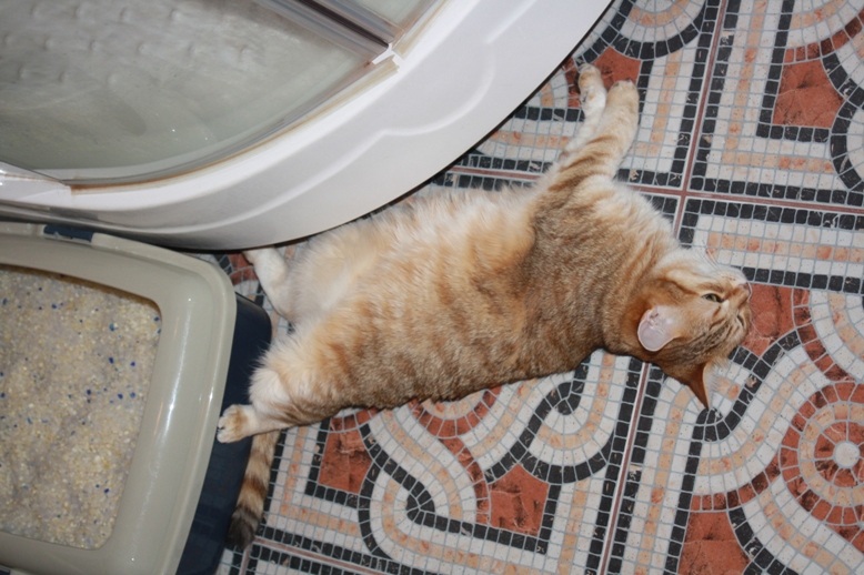 Наверное потому, что любит валяться на теплом полу в туалете возле лотка.