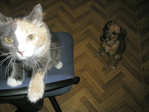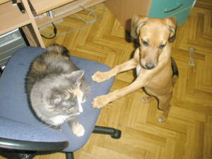 Кошка и собака - лучшие друзья у нас, друг без друга вообще никак. Челси кошку обожает, даже разрешает есть из миски своей и вытаскивать еду из пасти. Она вообще очень добрая, людей любит, кидается на всех чтобы облизать. Приходится гулять только на поводке, чтобы не дай Бог наш Крюгер никого не поцарапал и не испугал.