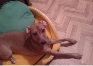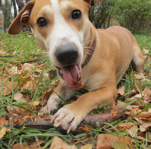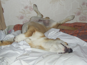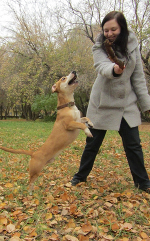 Хвост у неё как хлыст, если стоит рядом и начинает кому-то другому бешено вилять то ноге ой как больно. Любит прыгать и носится как угорелая, играет со всеми собаками, независимо от пола и возраста. В общем, любимица всеобщая