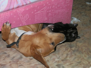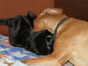 Только местные девко-собы на него рычат и играться совсем не хотят, а собо-парней у нас крайне мало.Ну, наша, по-моему, с парнями играет лучше, чем с деффками, так что на брата рычать не будет