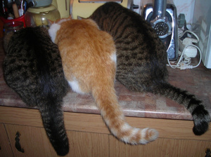 На столах они тоже дружно все лежат, когда я не вижу опять же. Но я на это вообще давно плюнула. Кошки выставочные, я им никогда в жизни не объясню почему на столе у эксперта лежать можно, а дома на таком же нет. Протираю от шерсти и все на этом.