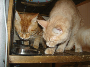 она вообще и корм его из миски таскает и воду пьёт из его мисок(встаёт на задние лапы и ковыряется в мисках по уши), а Плюха ждёт, пока она покушать изволит, причём гранулы у его корма огромные, он даже иногда специально для неё раскусывает, а она под ним стоит и ждёт