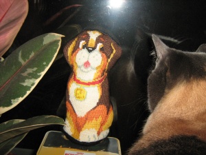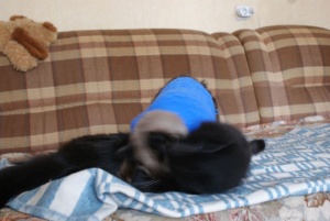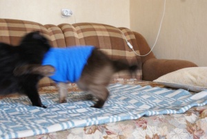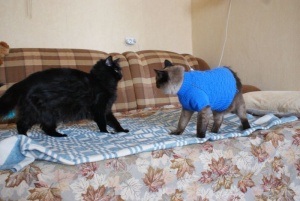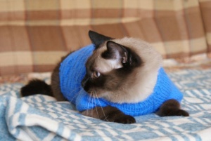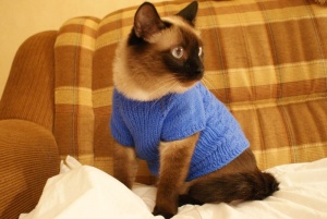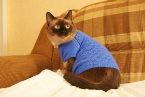 И еще учусь вязать кофточки на кошек и собак. Это Гриша мой в первом моем творении.