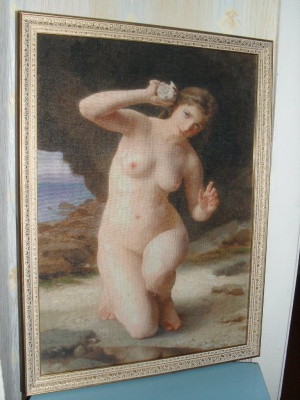 Осмелюсь все таки выложить,да простят меня участники форума ,что не о животных. Картина "Обнаженная с раковиной" размер готовой работы 68 х 91 см. 5 лет работы позади. Самый мелкий крестик, те кто вышивает,знают,что это такое