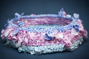 Достался мне как-то целый пакет обрезков - узкие длинные ленты. Все не могла придумать, куда их использовать. Уже хотела сжечь. А вчера наткнулась на картинку - вязанная из пряжи лежанка для кошки. Во! Быстренько смастерив крючок из палочки для китайской еды, сваяла вот такую лежаночку, диаметр примерно 45см. Осталось какой-нибудь матрасик внутрь сшить